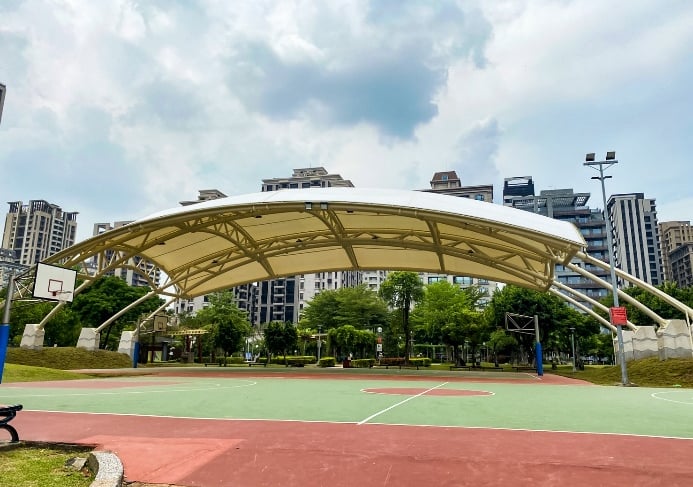 工程面積:PTFE,玻璃纖維膜材7,555 m²、結構用鋼材44.3噸、壓克力球場地坪 610 m²